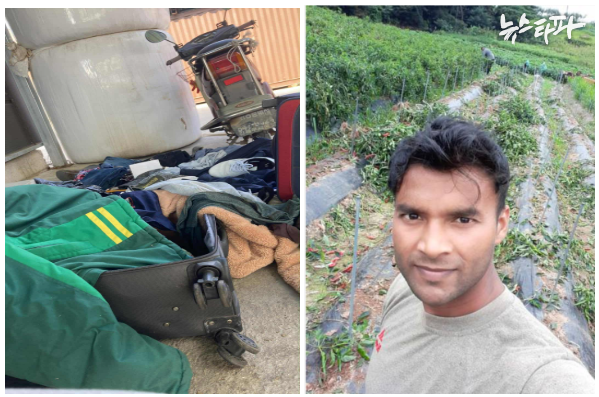 왼쪽은 수메스가 2022년에 일했던 전북 부안의 한우농장 사업주가 수메스의 옷가지를 밖으로 내던진 장면. 오른쪽은 수메스가 부안의 한우농장에서 일할 당시 모습. 사업주는 수메스에게 근로계약서에 없는 고추 농장 일까지 시켰다.