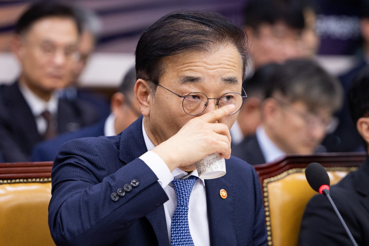 김윤덕 국토교통부 장관이 29일 국토교통부 국정감사에서 목을 축이고 있다. 사진=뉴스1