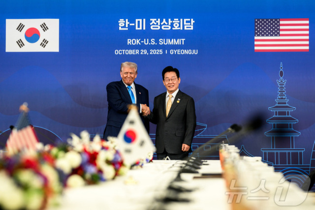 이재명 대통령과 도널드 트럼프 미국 대통령이 지난 29일 한미정상회담 장소인 국립경주박물관에서 만나 악수하고 있다. 뉴스1