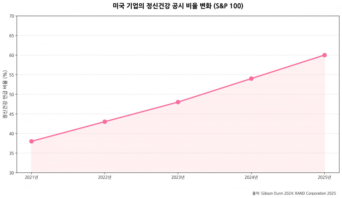 근로자의 정신건강 리스크는 투자자와 월가도 주목하는 새로운 재무 변수로 떠올랐다. 미국 증권거래위원회(SEC)가 인적자본 공시 의무화를 시행한 이후, 기업들은 연차보고서(10-K)에 직원 정신건강 및 복지 관련 정보를 명시적으로 공개하기 시작했다. 글로벌 로펌 '깁슨 던'의 작년 12월 분석에 따르면, S&P100 기업 중 ‘직원 정신건강 및 웰빙’을 언급한 10-K 보고서의 비율이 2021년 38%에서 2024년 54%로 상승했다.
