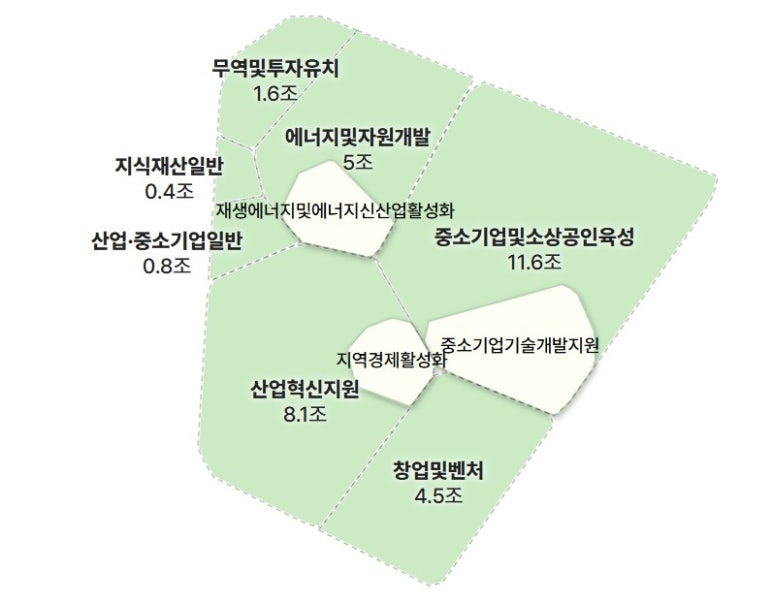 이재명 정부는 산업·중소기업 및 에너지 분야 예산을 4조1492억원(14.7%) 늘렸지만, 윤석열 정부는 문재인 정부보다 3조1498억원(-10.1%)을 감액했다. 코로나19 대유행으로 인한 소상공인 손실보상 제도화 사업 예산 2조2435억원이 없어진 것이 컸지만, 특정 프로그램 예산의 삭감도 두드러졌다. 재생에너지 및 에너지신산업 활성화 예산이 8873억원(-57.1%), 지역경제 활성화 예산이 3089억원(-27.6%), 중소기업 기술개발 지원 예산이 2614억원(-13.4%) 줄었다. 반대로 이 정부는 이 예산들을 각각 5620억원(84.4%), 2244억원(27.6%), 8820억원(52.3%) 늘렸다.