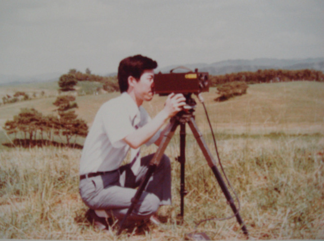 이종민 전 소장이 1970년대 국내 최초로 개발한 휴대용 레이저 거리 측정기로 야외 성능을 시험하고 있다. 사진 제공=이종민 전 소장