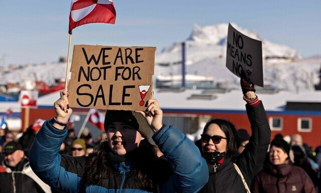 지난 3월15일(현지시각) 그린란드 수도 누크의 미국 영사관 앞에서 ‘그린란드는 그린란드인의 것’이라는 이름으로 열린 집회 모습. 한 시민이 ‘우리는 판매용이 아니다’라는 손팻말을 들고 있다. AFP 연합뉴스