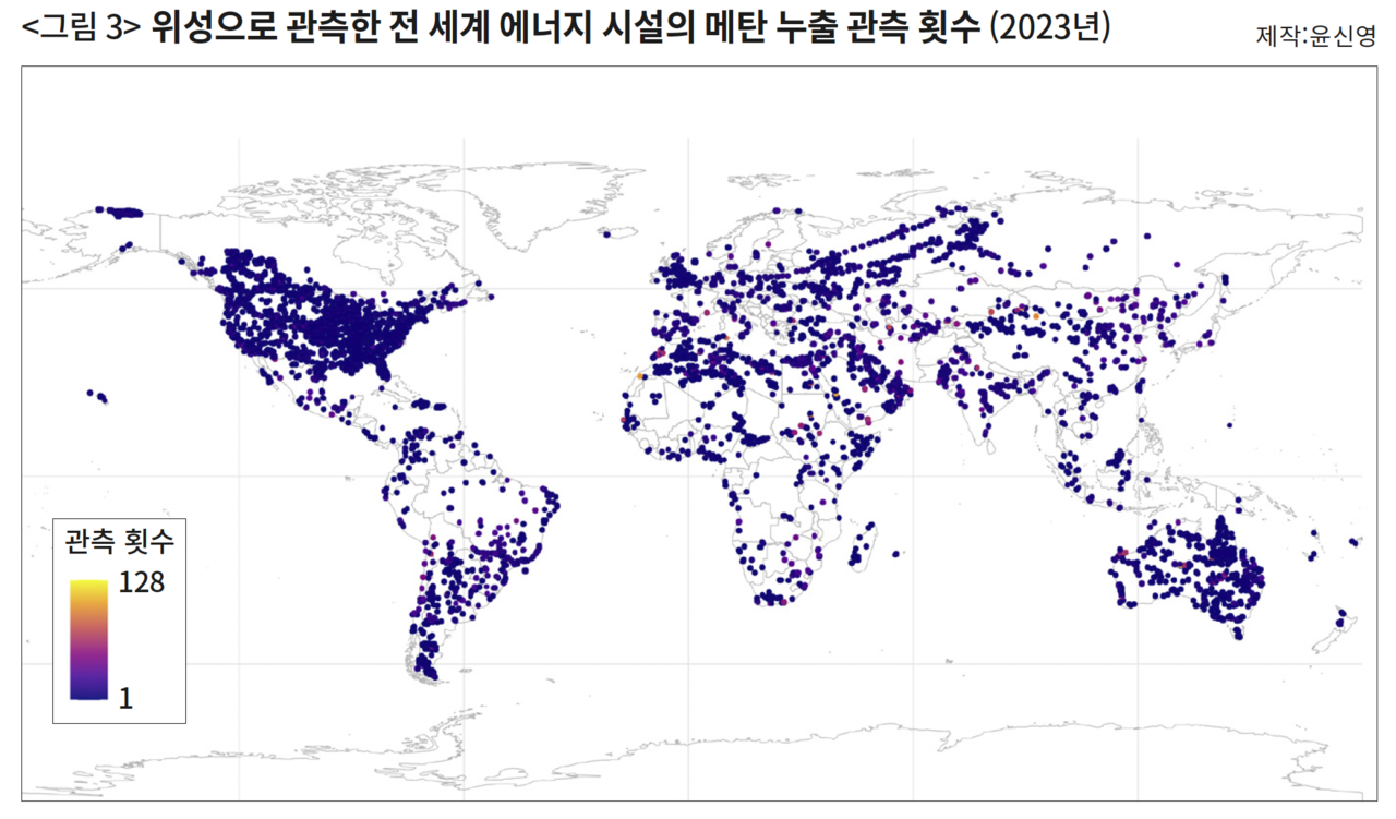 〈그림 3〉 위성으로 관측한 전 세계 에너지 시설의 메탄 누출 관측 횟수. ⓒ윤신영