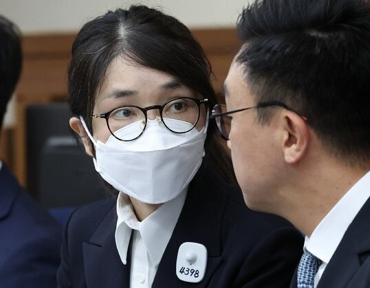 김건희 여사가 지난해 9월24일 오후 서울 서초구 서울중앙지법에서 열린 첫 재판에 출석해 최지우 변호사와 이야기를 나누고 있다. 김 여사는 왼쪽 가슴에 ‘수용번호 4398’이 적힌 배지를 달았다. 연합뉴스