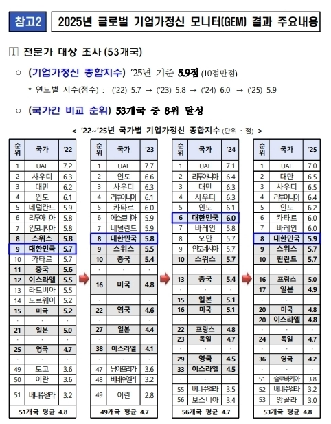 지난해 기준 우리나라의 기업가 정신 종합지수(NECI)는 53개국 중 8위(5.9점)를 기록했다. 지난해 GEM 참여국 53개국의 평균 점수(4.8점)보다 1.1점 높은 수준이다. 1위는 7.0점을 획득한 아랍에리미트(UAE)가 차지했다. 2위는 대만(6.5점), 3위는 사우디아라비아(6.5점)였다. 일본(4.9점)은 17위, 미국(4.8)은 20위였으며 가장 아랫 등수인 53위는 앙골라(3.0점)였다.