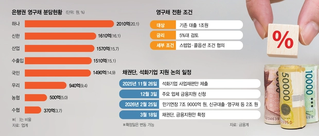 하나와 신한 등 4대 은행이 충남 대산 석유화학 설비를 통합하는 ‘대산 1호 프로젝트’를 지원하기 위해 6000억 원 규모의 신종자본증권(영구채)을 인수하기로 했다. 채권단은 이를 포함해 총 1조 원 규모의 기존 대출을 영구채로 전환해 구조조정 속도를 높일 방침이다.