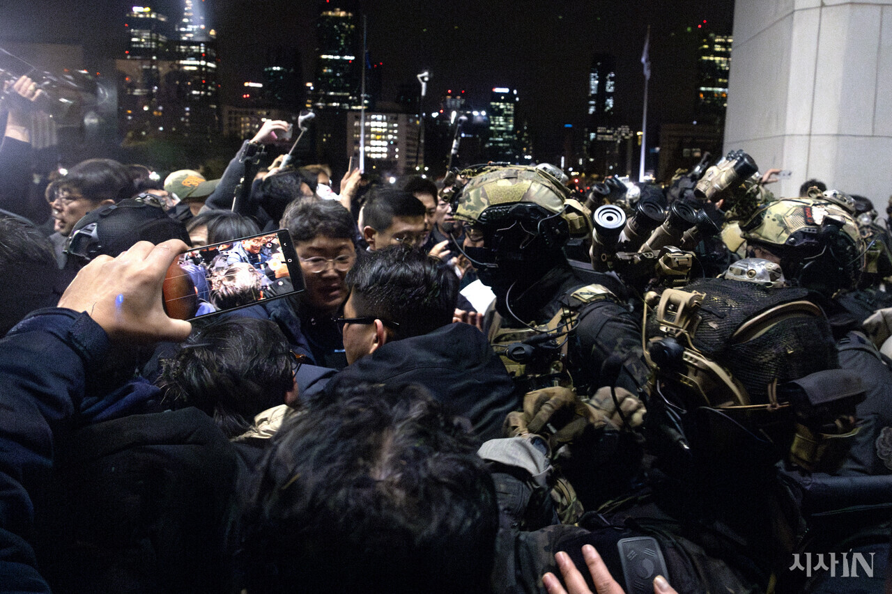 2024년 12월4일 새벽, 국회 관계자들이 국회의사당에 진입하려는 무장 계엄군을 막고 있다.ⓒ시사IN 박미소