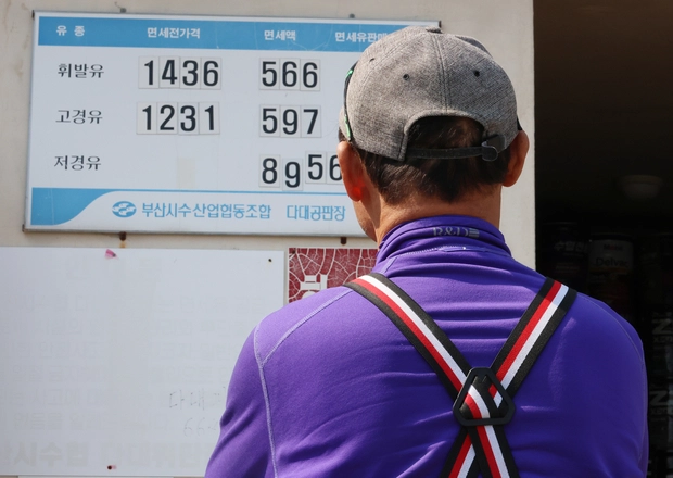 최근 중동 전쟁 여파로 유가가 급등한 가운데 10일 오후 부산 사하구 부산시수협 다대위판장 급유소에서 한 어민이 유가가 표시된 가격판을 보고 있다. 연합뉴스