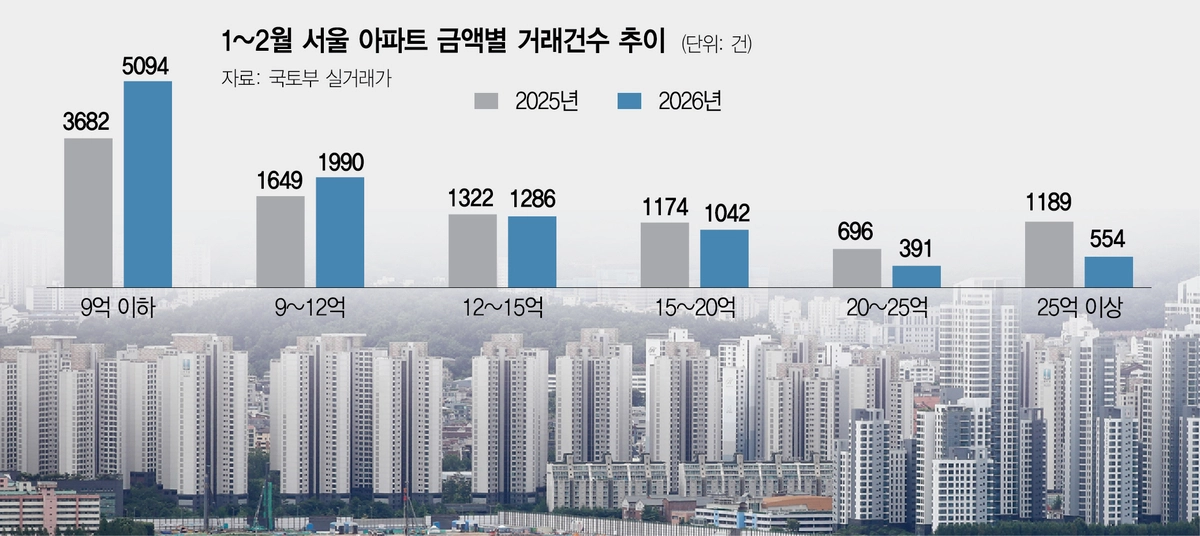 서울 아파트는 지난해 1~2월 9712건, 올해 같은 기간 1만 357건이 거래돼 645건 늘어나는데 그쳤지만 이 기간 9억 원 이하 아파트 거래는 3682건에서 5094건으로 1412건이나 늘었다. 9억~12억 원대 아파트의 거래도 올해 1~2월 1990건에 달해 전년 동기 1649건 대비 20% 이상 증가했다.