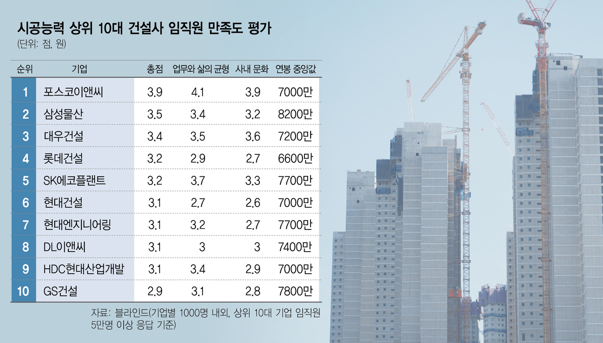 23일 서울경제신문이 직장인 커뮤니티 플랫폼 블라인드에 의뢰해 지난해 기준 시공능력 상위 10개 건설사의 재직자 만족도를 조사한 결과 포스코이앤씨가 총점 3.9점으로 1위를 기록했다. 국내 상위 10대 건설사의 재직자 만족도가 조사된 것은 이번이 처음이다. 이번 조사에는 각 기업별 1000명 내외, 총 5만 명 이상의 응답 데이터가 분석 대상으로 활용됐다. 만족도는 커리어 향상, 업무와 삶의 균형, 급여 및 복지, 사내문화, 경영진 등 5개 항목을 종합해 5점 만점 기준으로 산출됐다.