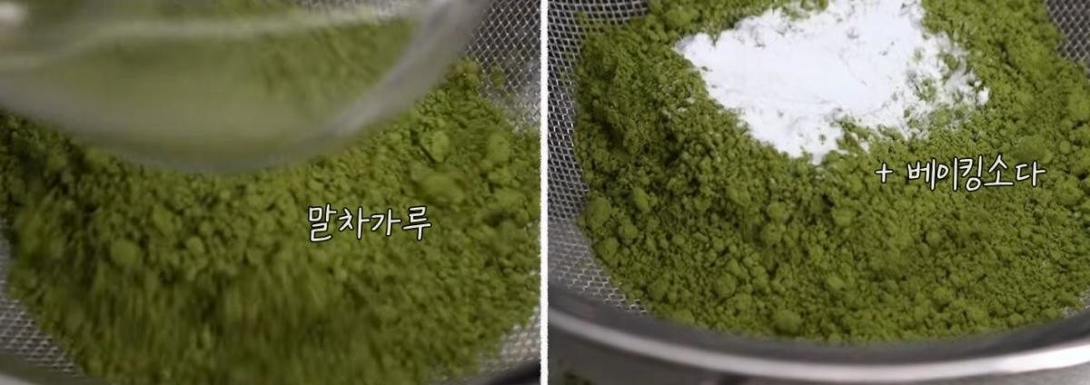 볼에 달걀, 설탕, 올리고당, 소금을 넣고 설탕이 녹을 정도로 섞는다. 세게 젓거나 거품을 낼 필요는 없다. 여기에 우리밀, 말차 분말, 베이킹파우더를 체에 쳐서 넣고 가루가 보이지 않을 때까지 충분히 섞는다. 밀가루는 수분을 만나면 뭉치는 성질이 있어 반드시 체에 쳐서 고운 입자로 만든 뒤 넣어야 반죽이 고르게 섞인다.