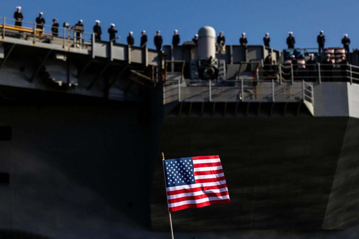 31일(현지 시간) 미국 버지니아주 노퍽 해군 기지에서 중동으로 출항하는 조지 HW 부시 항공모함에서 승조원들이 환송을 받고 있다. AP연합뉴스