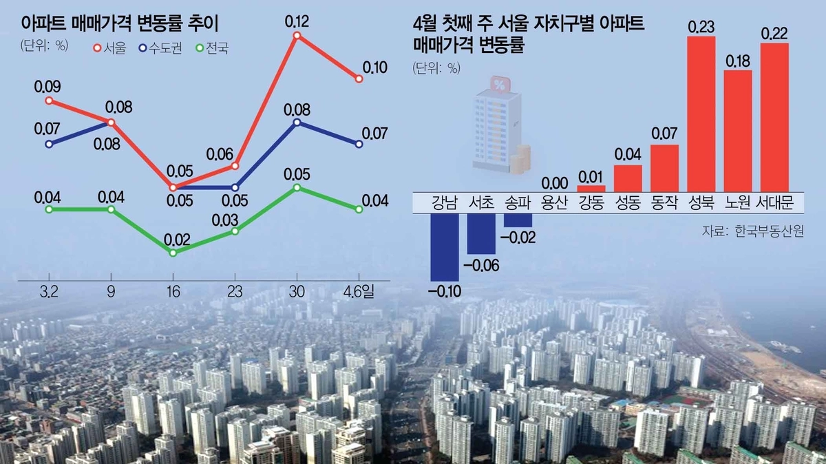 서울 아파트값이 3주 만에 상승폭을 줄였다. 양도소득세 중과 유예 종료를 한 달 앞두고 다주택자 매물이 쏟아진 강남3구가 7주 연속 하락하며 오름세를 억눌렀다. 반면 성동·용산·강동 등 한강벨트는 실수요와 재건축 기대를 바탕으로 다시 상승 반전, 서울 집값이 지역별로 엇갈리는 혼조세를 나타냈다. 9일 한국부동산원이 발표한 ‘주간 아파트 가격 동향’에 따르면 4월 첫째 주(4월 6일 기준) 서울 아파트 매매가격 상승률은 0.10%로, 전주 대비 0.02%포인트 감소했다. 서울 아파트값 상승세는 7주 연속 오름폭이 줄어 0.05%까지 낮아졌다가 이후 3월 넷째주부터 2주 연속으로 다시 확대되며 0.12%까지 반등했다가 상승폭이 다시 줄어들었다.